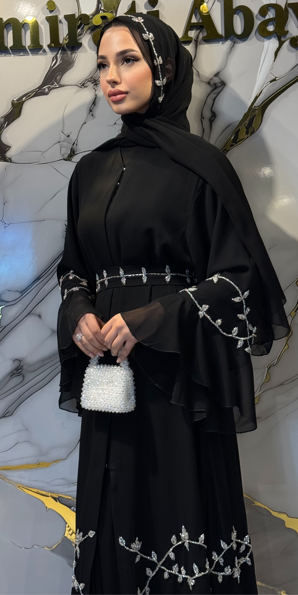 Inspired by Dubai style, this exclusive abaya combines elegance and luxury with high-quality black Korean chiffon fabric and handcrafted Swarovski crystal embellishments . The lightweight and flowing chiffon texture offers all-day comfort, while the sparkle of the Swarovski crystals adds a dazzling touch of sophistication to the design.