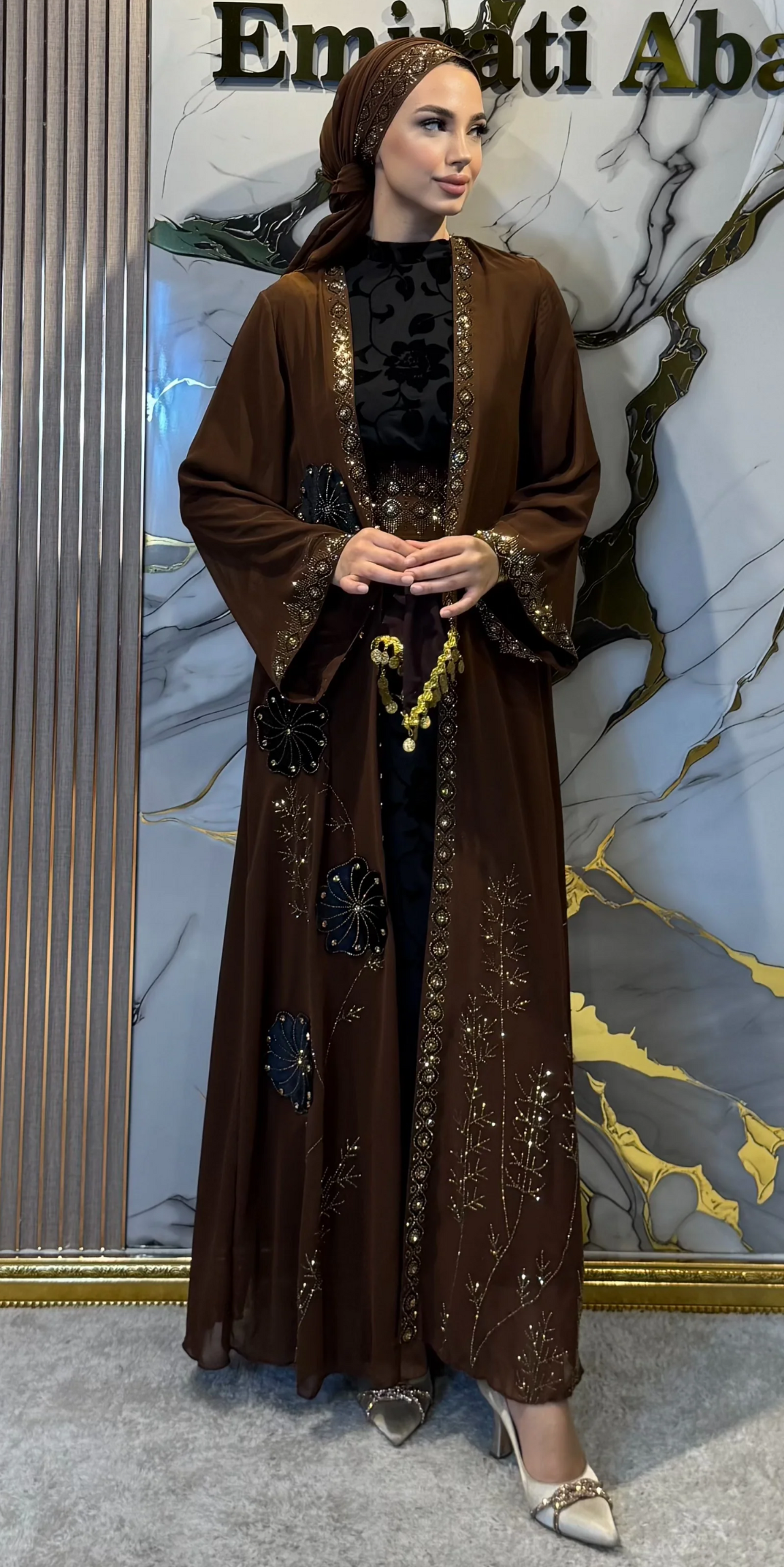 Gold Flower Embellished Brown Traditional Abaya Set - 4-Piece Luxury Set (Includes Shawl, Belt and Flocked Undershirt) LY35 GSK