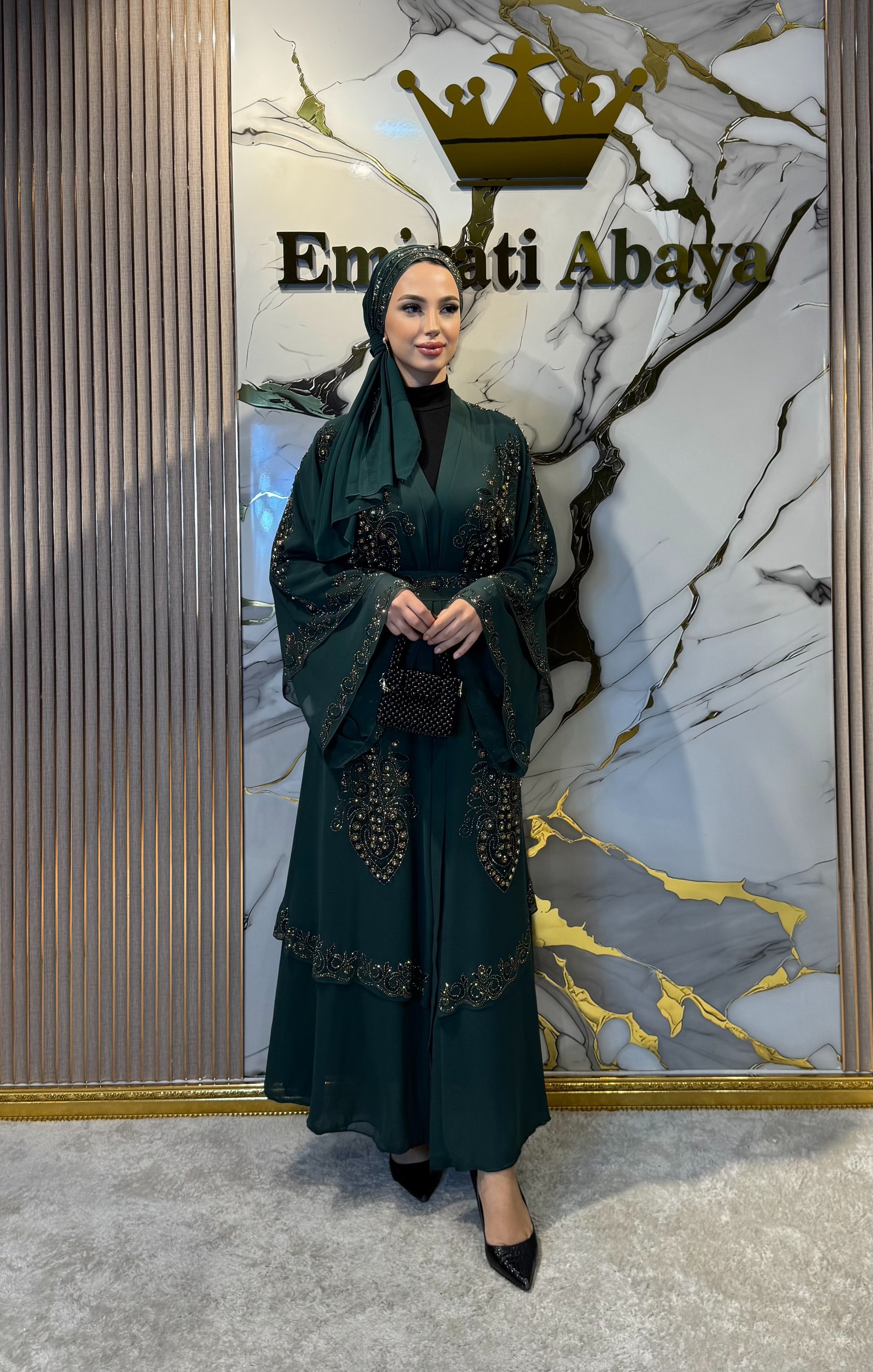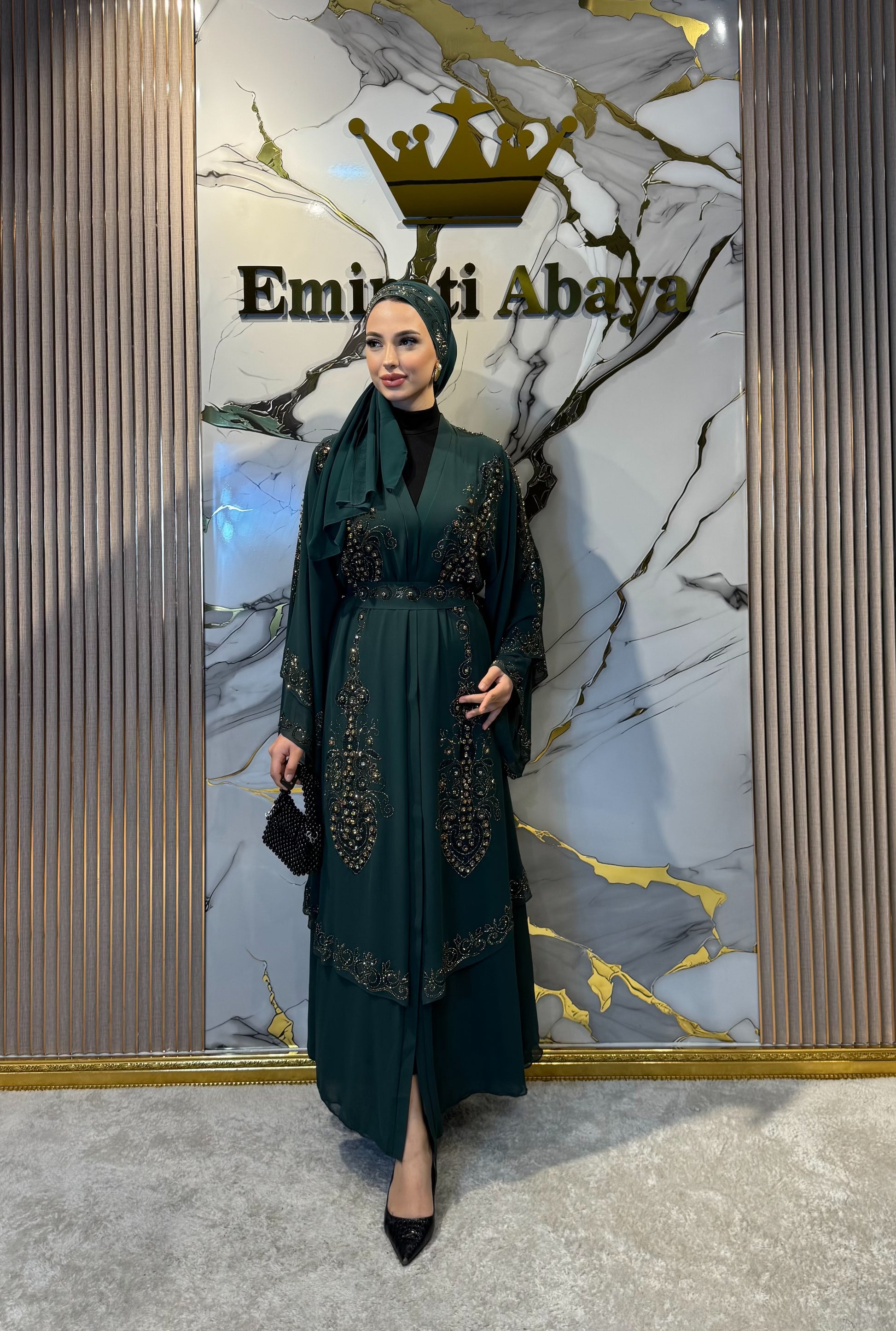 Şifon zarafetini çift katlı tasarımla birleştiren bu Yeşil abaya, etek, omuz ve kollardaki altın taş detaylarıyla göz kamaştırıyor. Taş işlemeli kemer ve şalıyla asil bir siluet sunar. İç elbise ve görseldeki aksesuarlar dahil değildir.