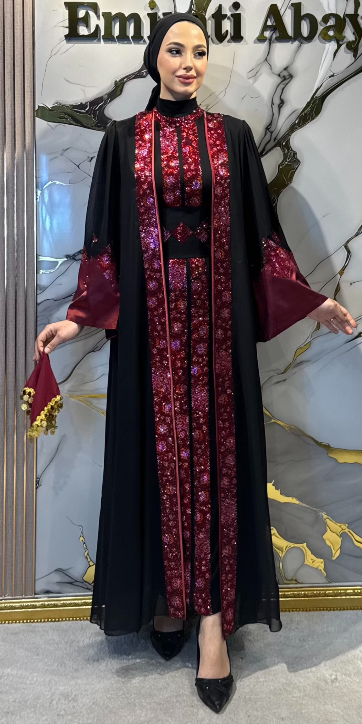 Designed with the lightness and elegant stance of chiffon fabric, this open abaya offers a dazzling appearance with its red embroidered details. The red stripes on the front add a modern touch, while the red patterns on the collar and sleeves provide a noble air. The inside is made of comfortable and flexible combed cotton fabric, offering comfortable use. This abaya, which will complete your elegance in both daily and special invitations, offers elegance and comfort together.
