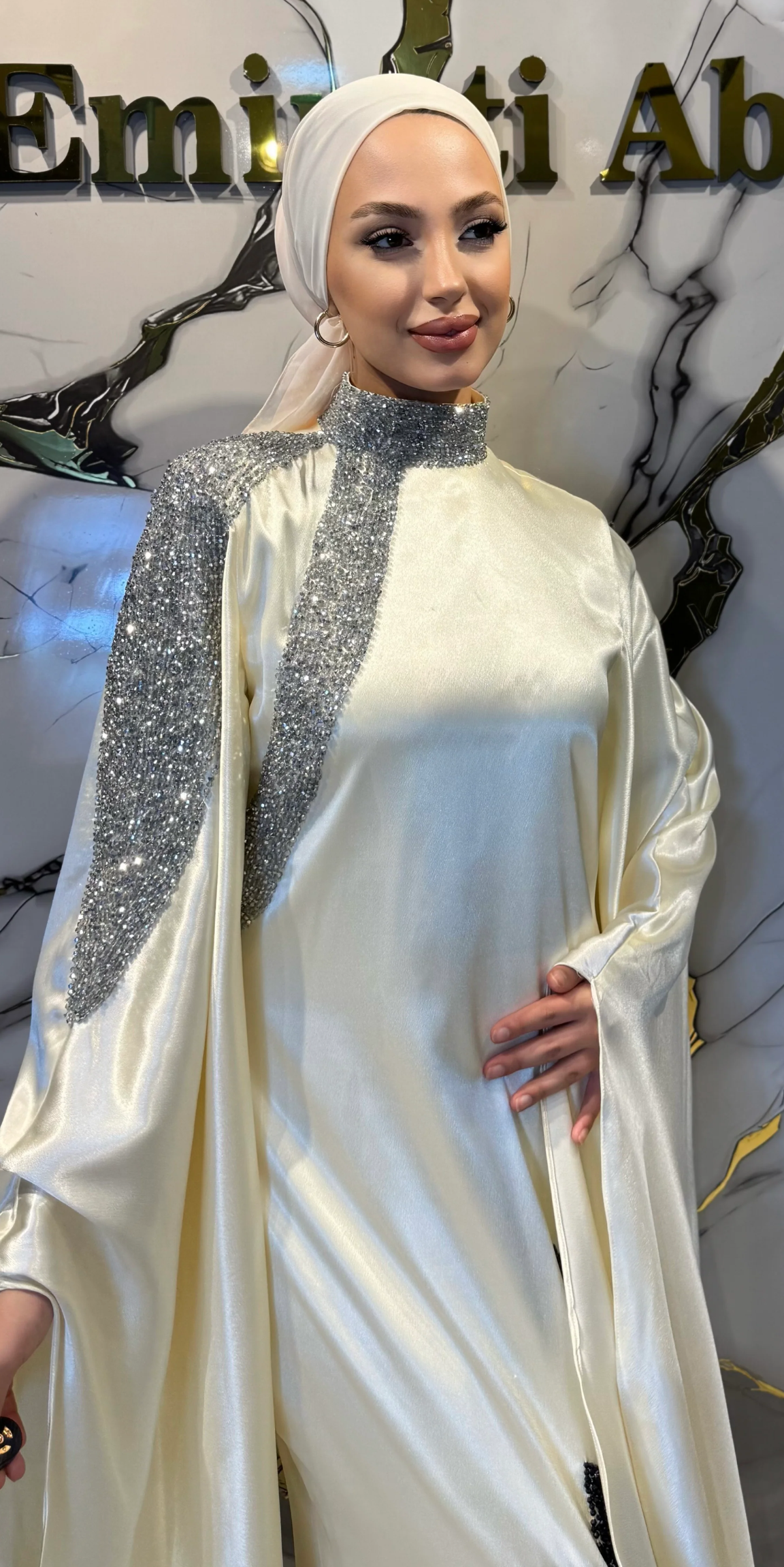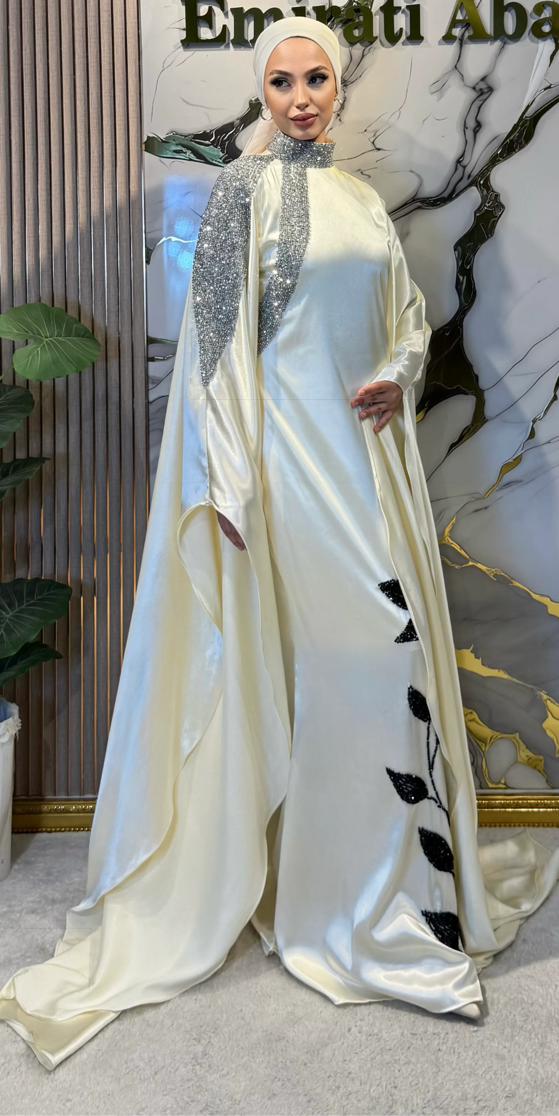 This stunning cream evening gown rewrites the definition of elegance with its luxurious satin fabric and meticulously crafted stone details. The floral motif on the front, embroidered with black stones, adds depth to the simplicity, while the white stones on the shoulders and neckline add a touch of royal brilliance. Ideal for a striking elegance at special occasions like engagements and engagements.
