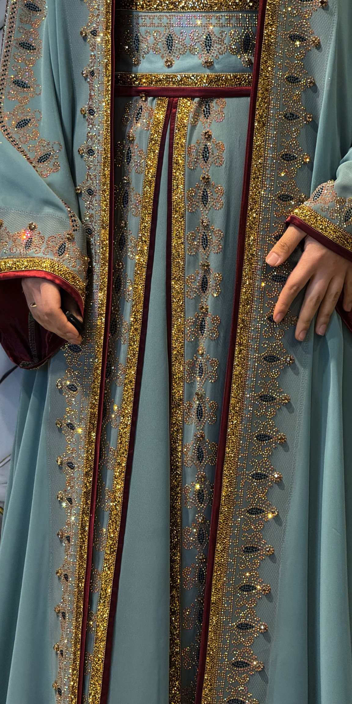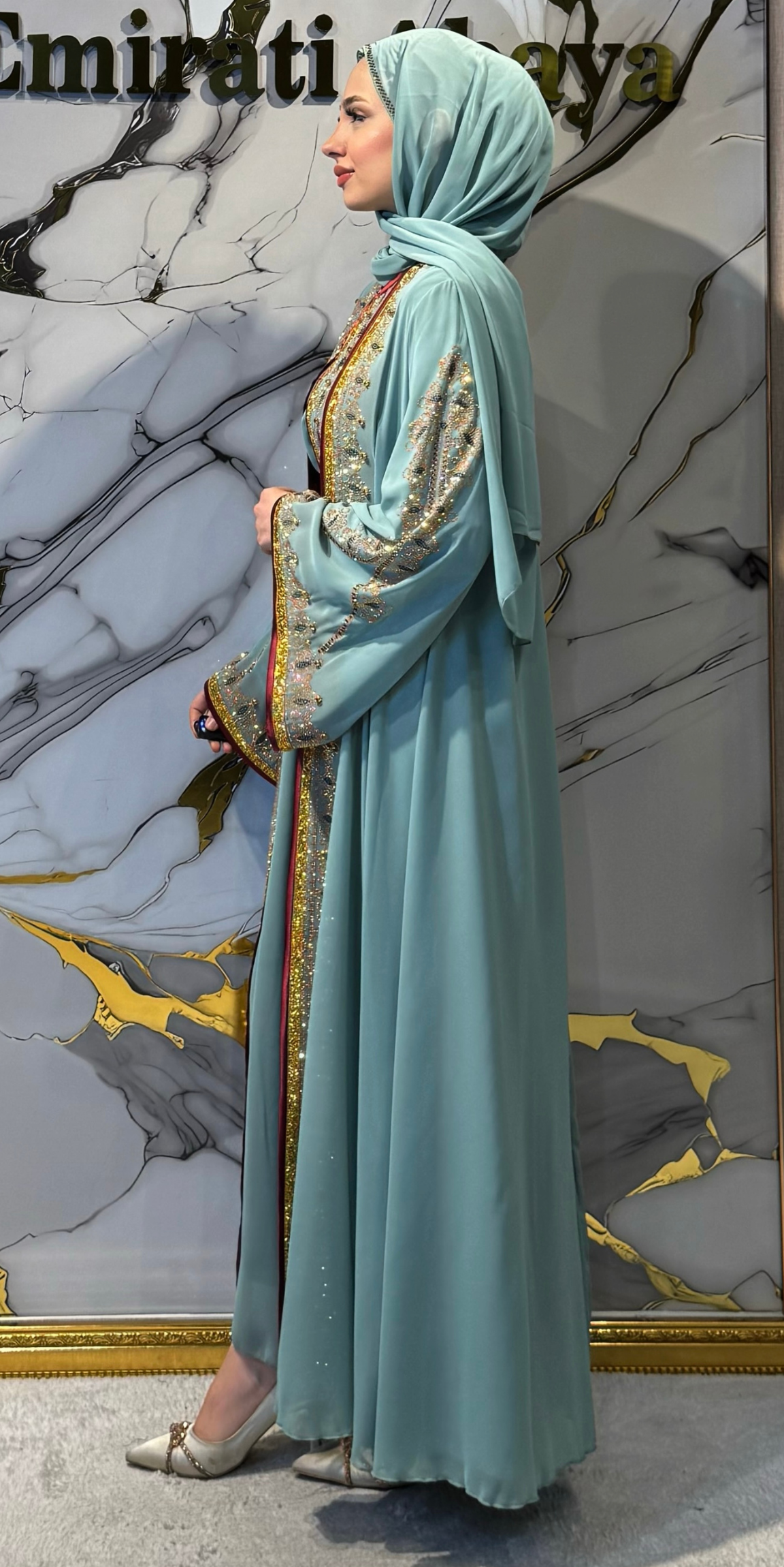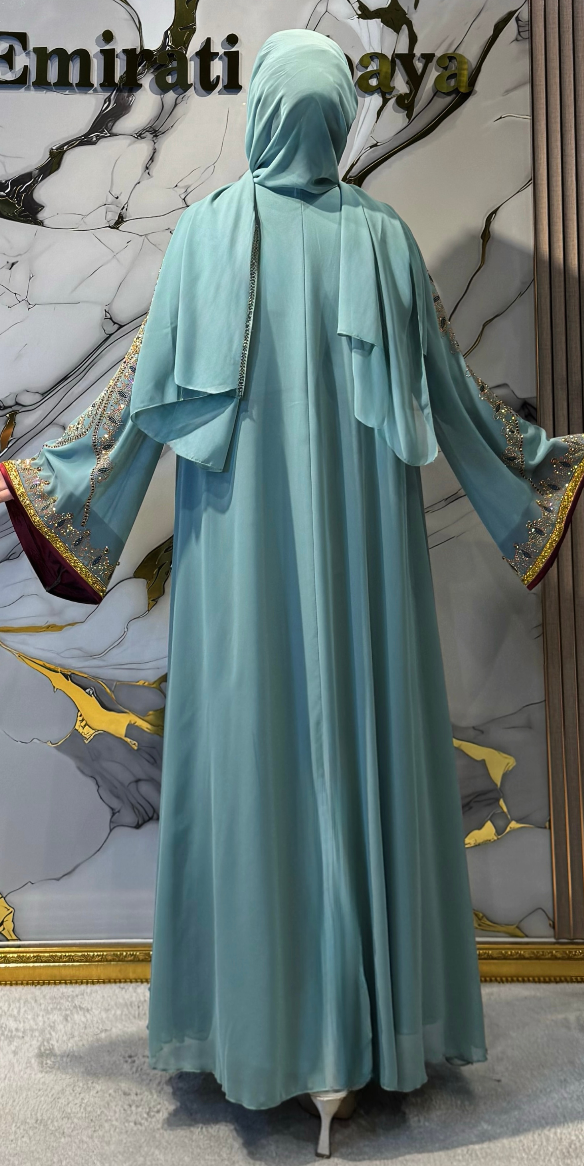 Its lightweight chiffon structure allows for comfortable movement, while its open front design gives it a modern and contemporary look. Gold stone embellishments add a touch of luxury to the regional style, completing your elegant look.