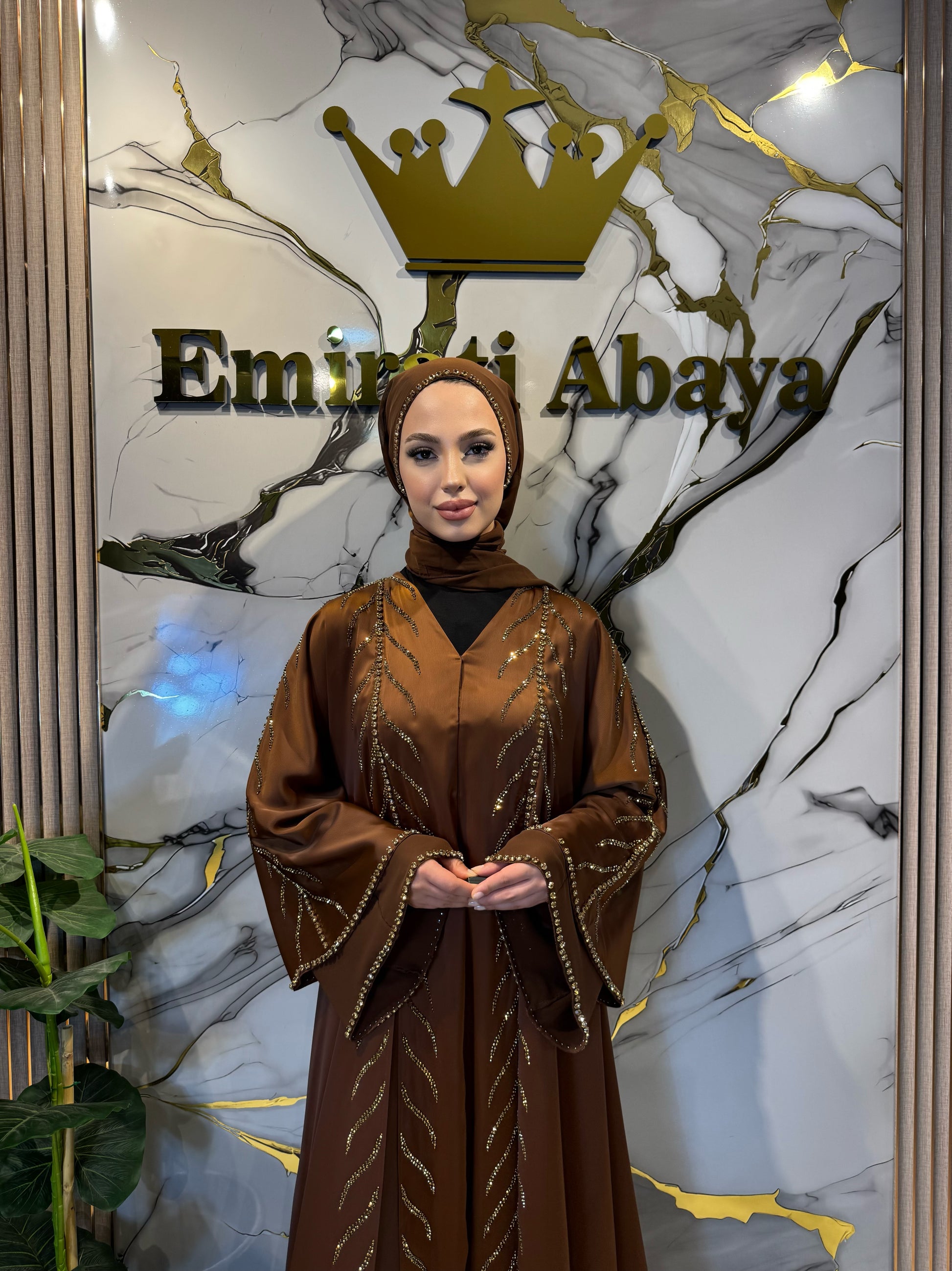 Düğünler, özel davetler, akşam etkinlikleri ve şık organizasyonlar için mükemmel bir seçimdir. Kahverengi tonu ve altın taş işlemeleriyle zarafeti göz alıcı şekilde yansıtır.
