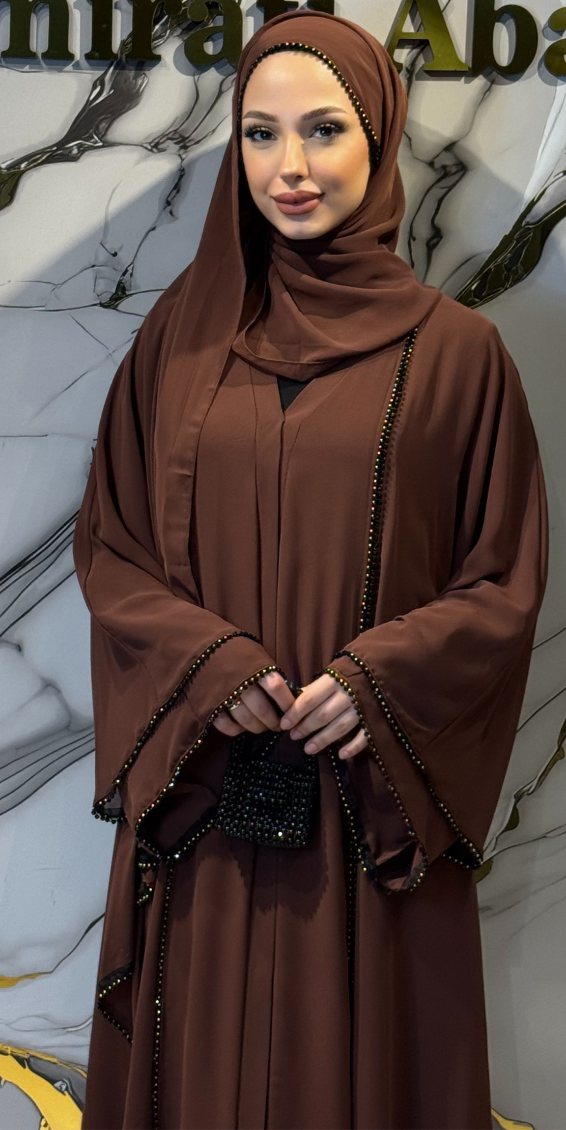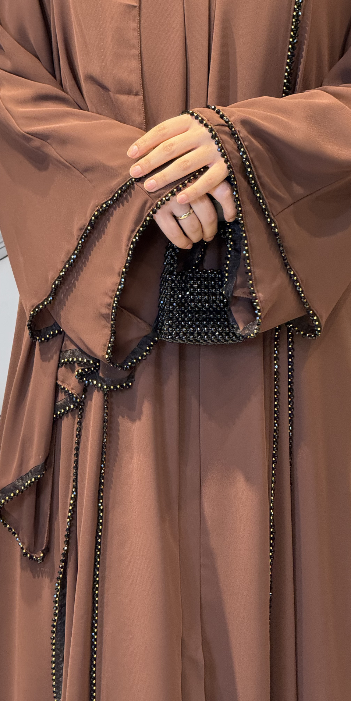 Önü Yırtmaçlı Siyah Gold Taşlı Kahverengi Şifon Abaya | TM06 HM GSK