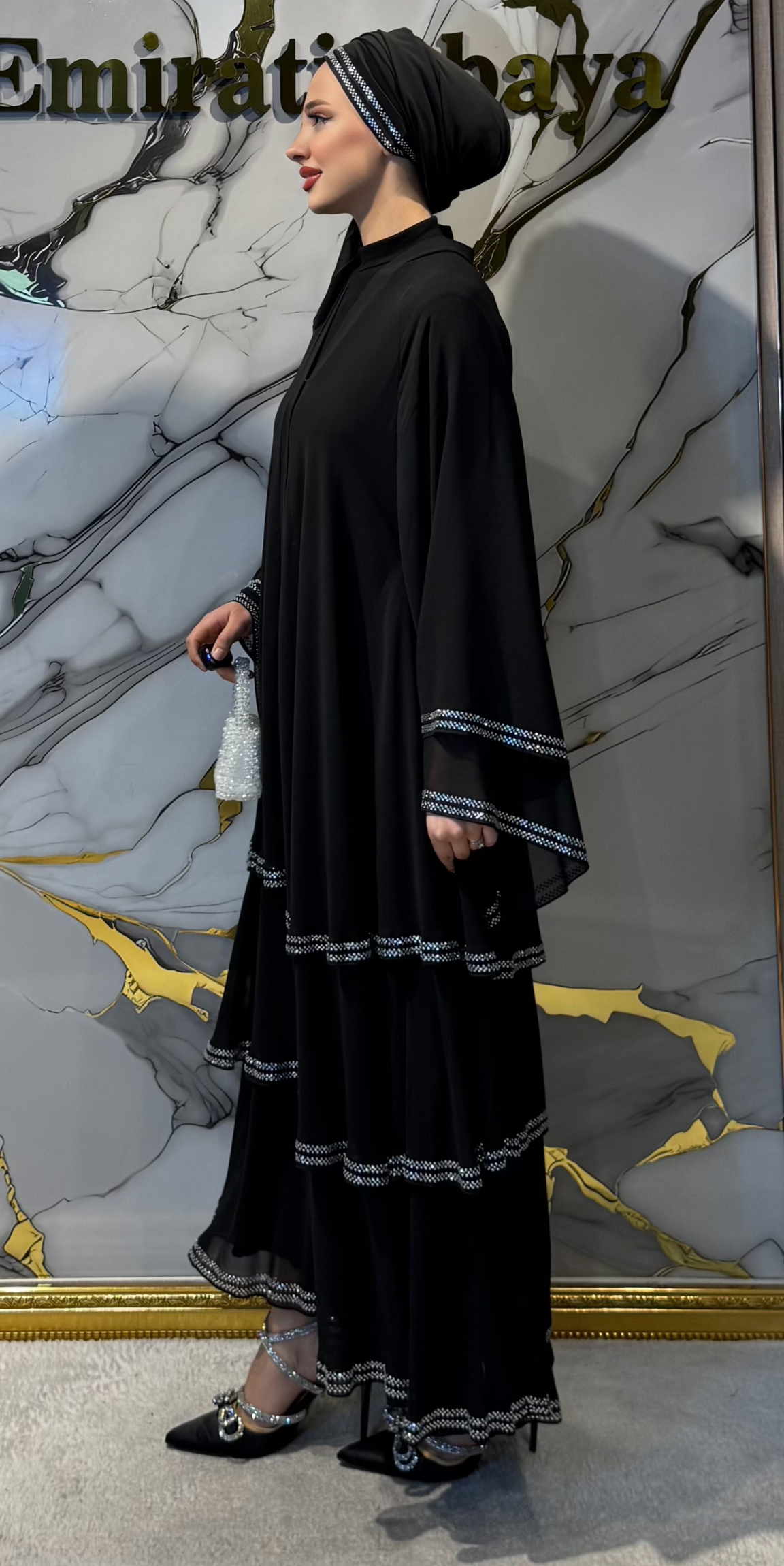 An elegant, three-layered, custom-designed abaya in black. Each layer features white stone details, and the sleeves are also adorned with stone embellishments. This chiffon abaya, with its snap closure for practical use, comes with a matching shawl and belt. The lightweight chiffon fabric allows for comfortable movement, while its layered structure creates a feminine look. Perfect for everyday wear and special occasions, complete your stylish look with this abaya.