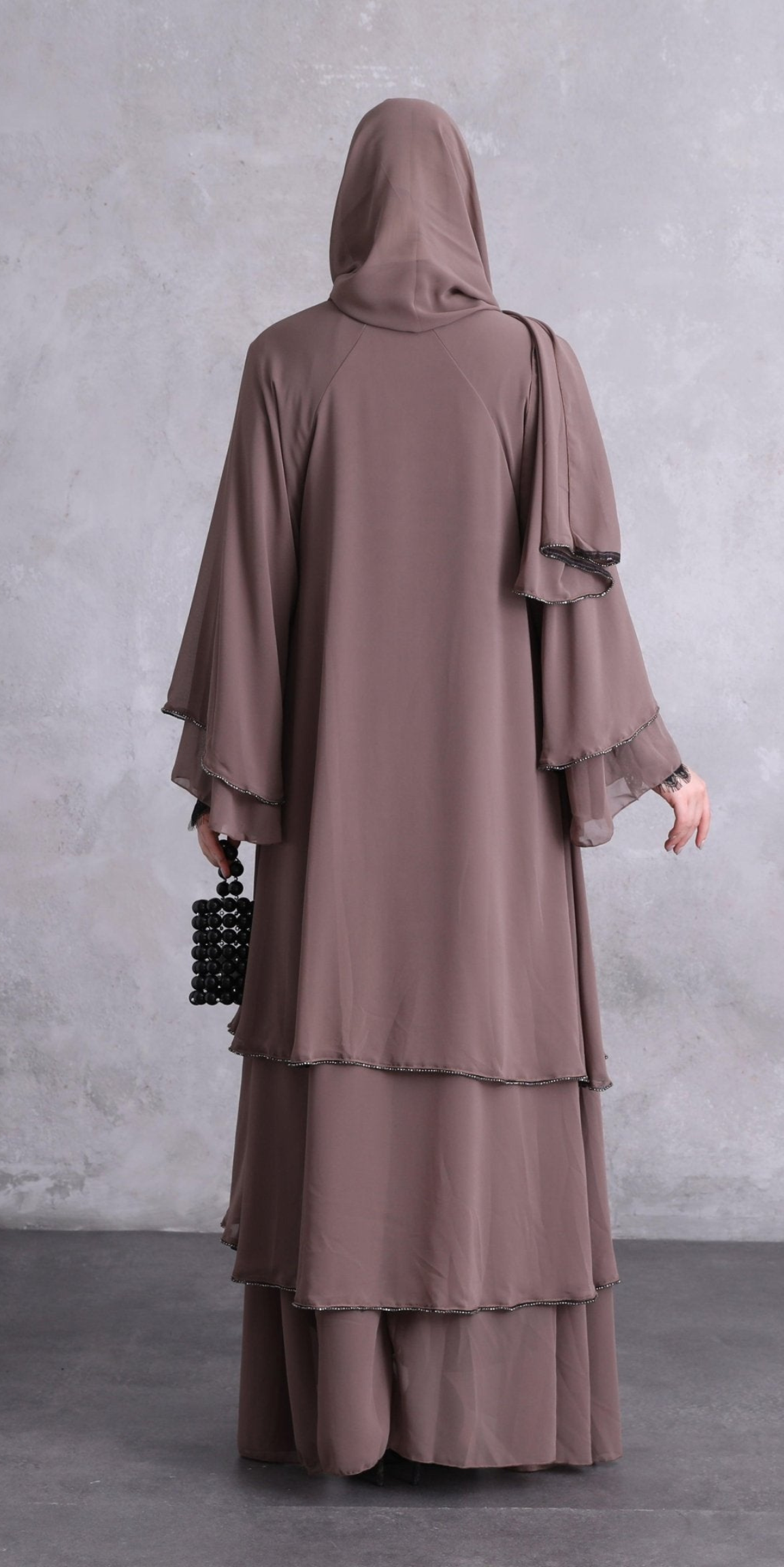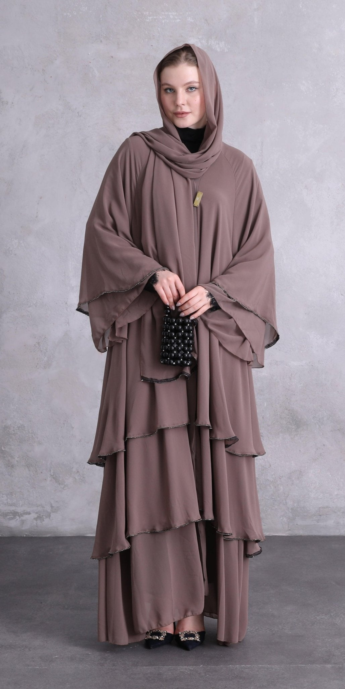 Designed for daily use, this three-layered abaya offers a simple yet stylish look with its mink color and Swarovski stone decorations. While adding elegance to your daily style with its light and comfortable structure, it allows you to shine at any moment with its striking stone details.