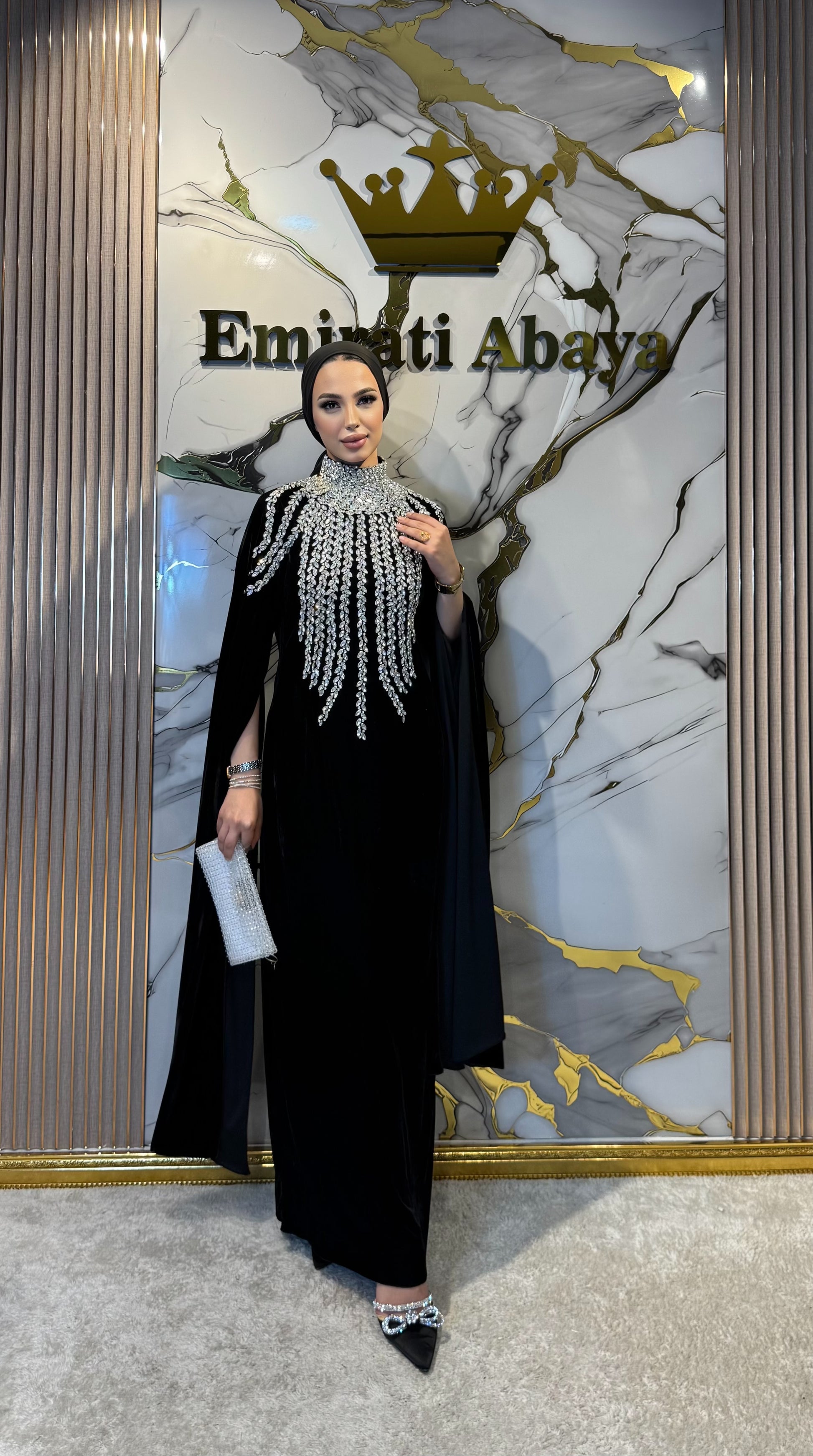 Bu lüks kadife abaya, yakadan başlayıp öne doğru zarif bir şekilde uzanan el işçiliği beyaz taş detaylarıyla büyüleyici bir görünüm sunar.