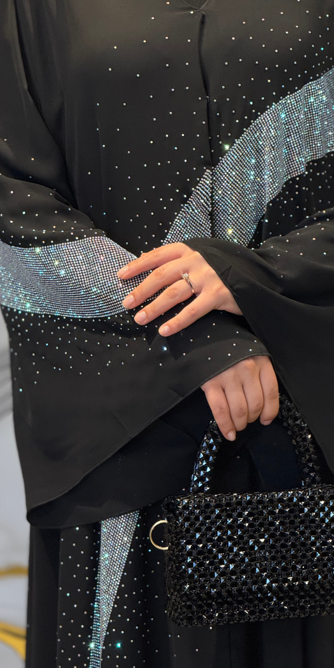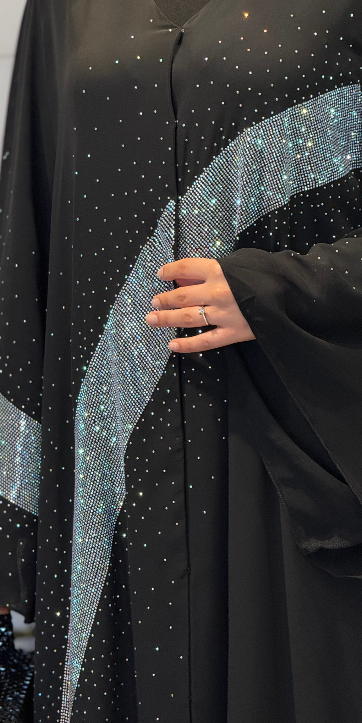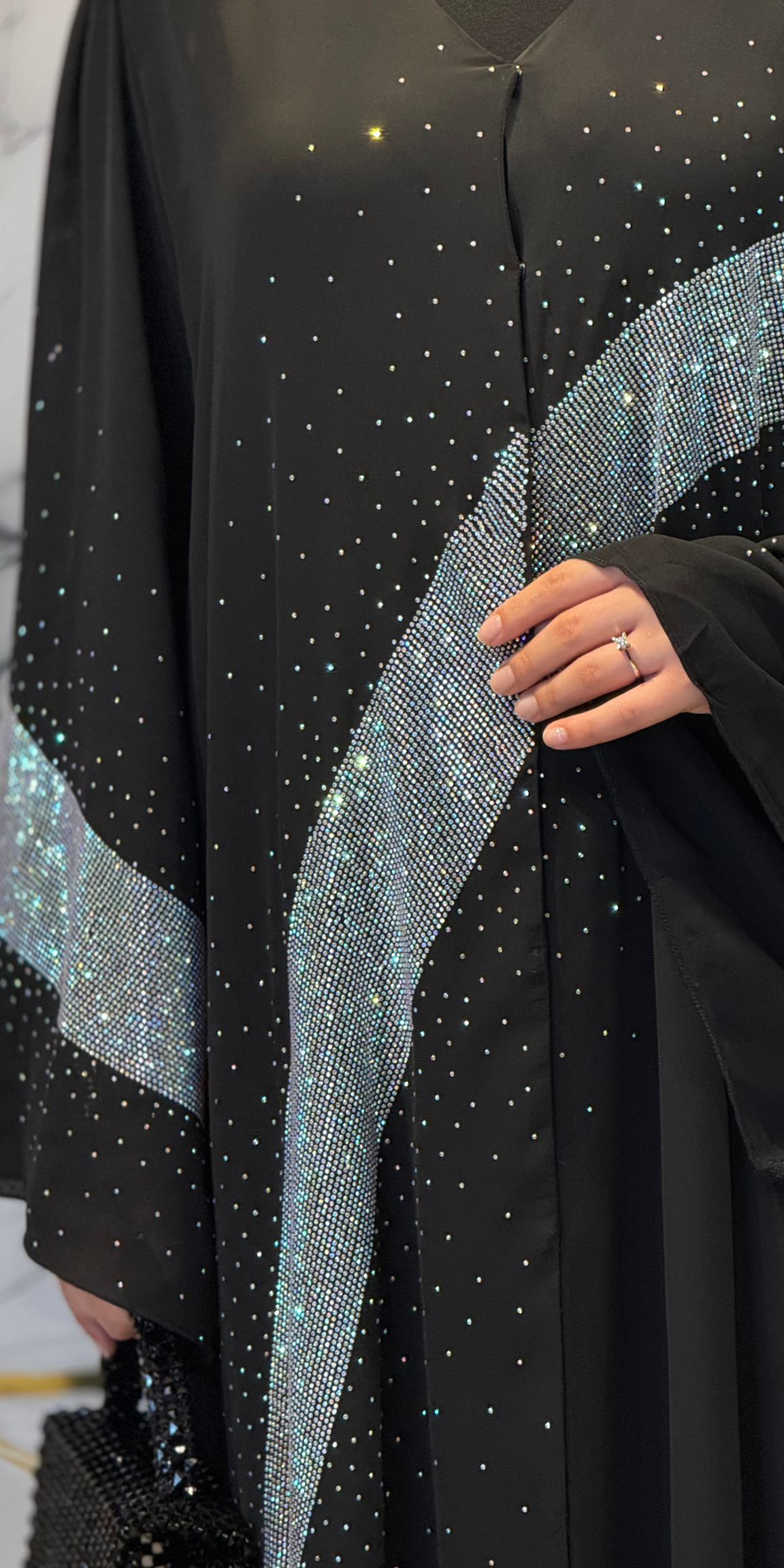 - Tüm abaya boyunca ışıltılı taş noktalar