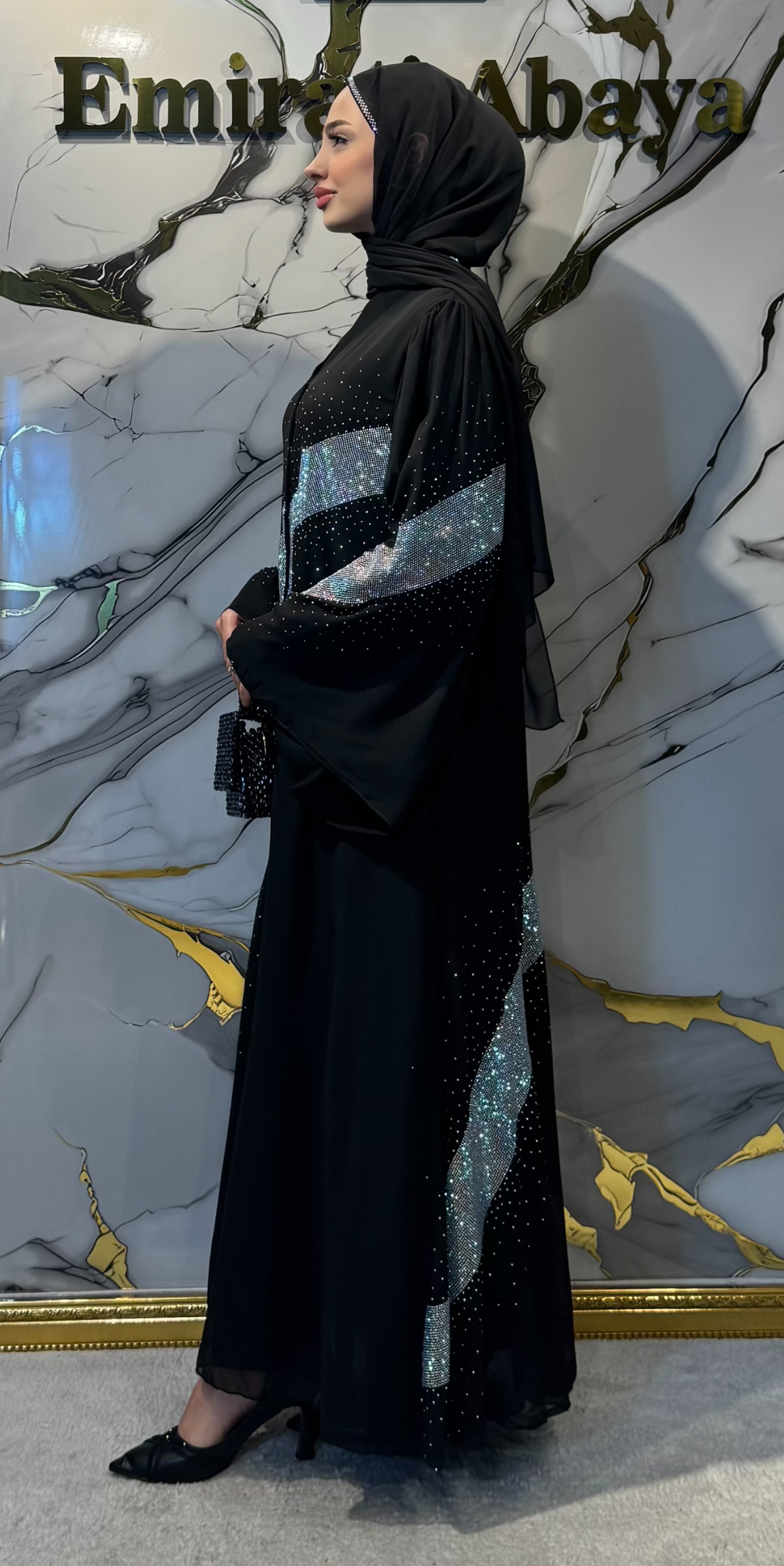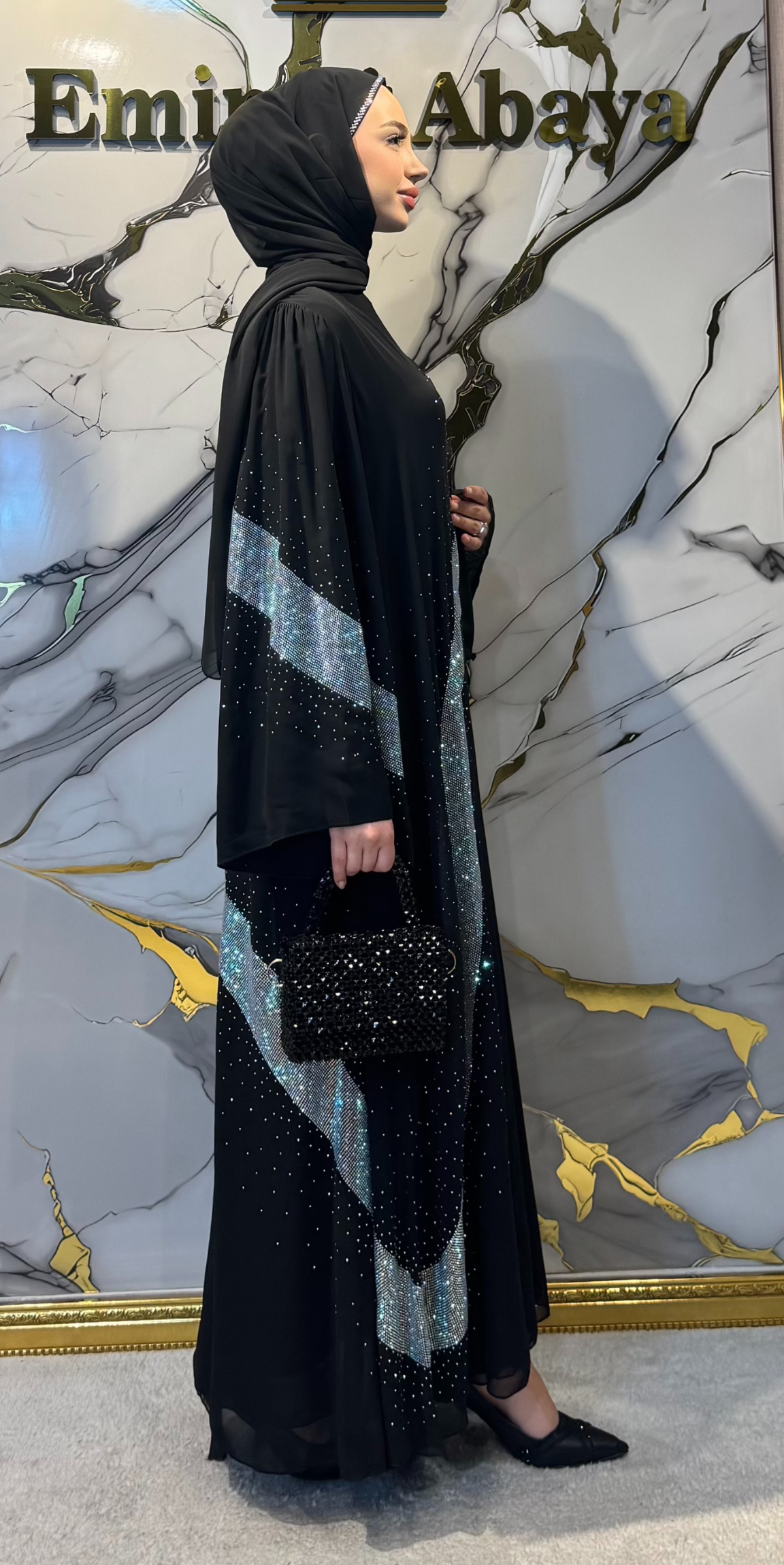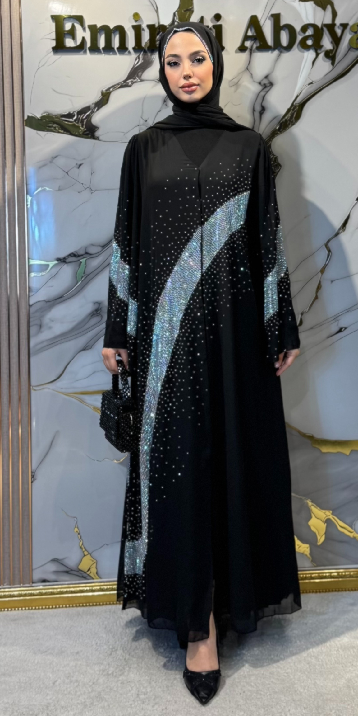 - Tüm abaya boyunca ışıltılı taş noktalar
