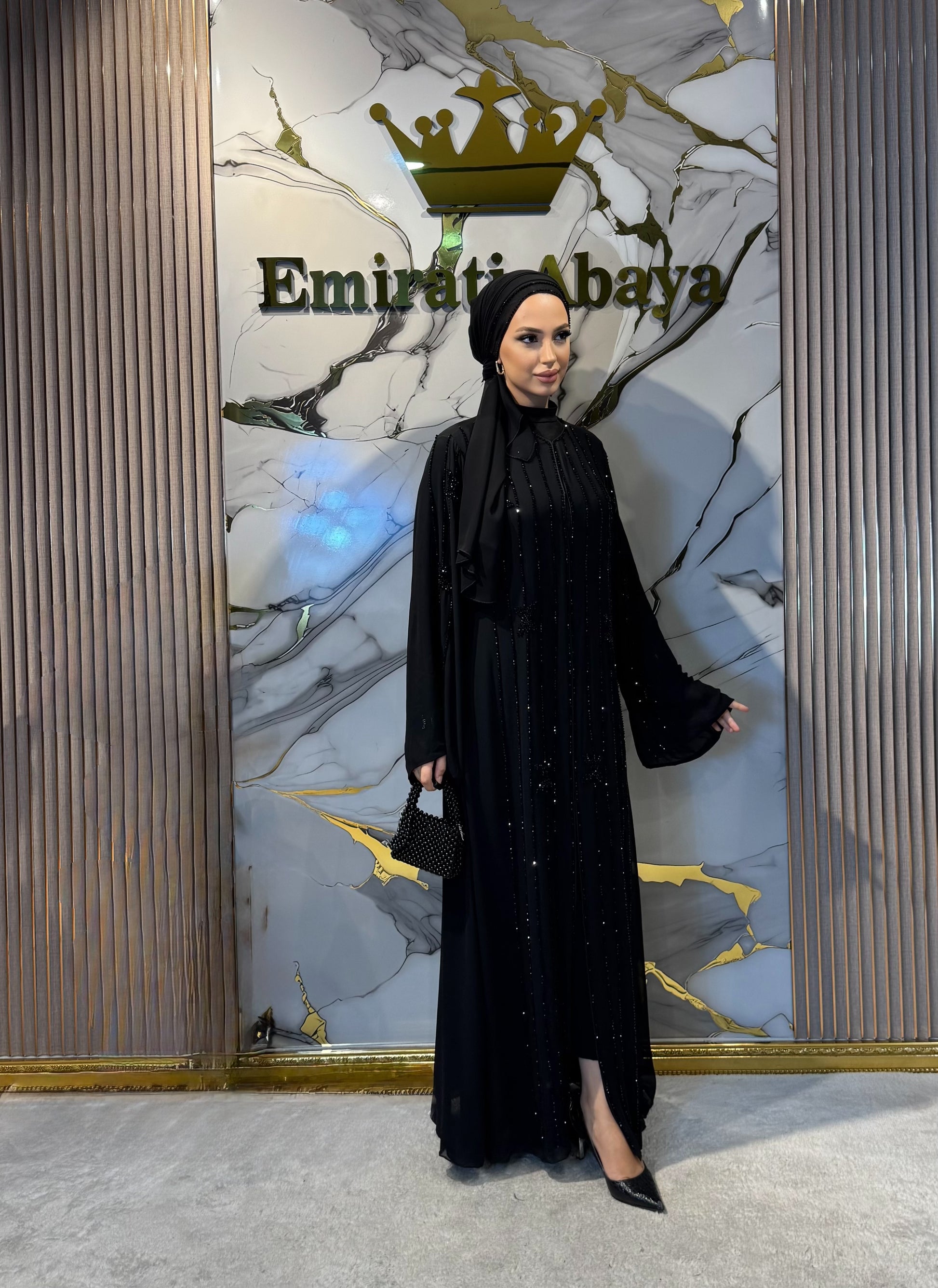 Zarafetin ve ışıltının buluştuğu bu siyah şifon abaya, özenle işlenmiş siyah taşlarla dikkat çeker. Çizgi çizgi inen taş işlemeleri arasında zarif çiçek detayları yer alır. Taşlar tamamen el işçiliğidir. Abaya yalnızca kendi şalıyla birlikte gelir, içlik ve çanta fiyata dahil değildir. Özel günlerde veya günlük şıklıkta tercih edebileceğiniz nadir parçalardandır.