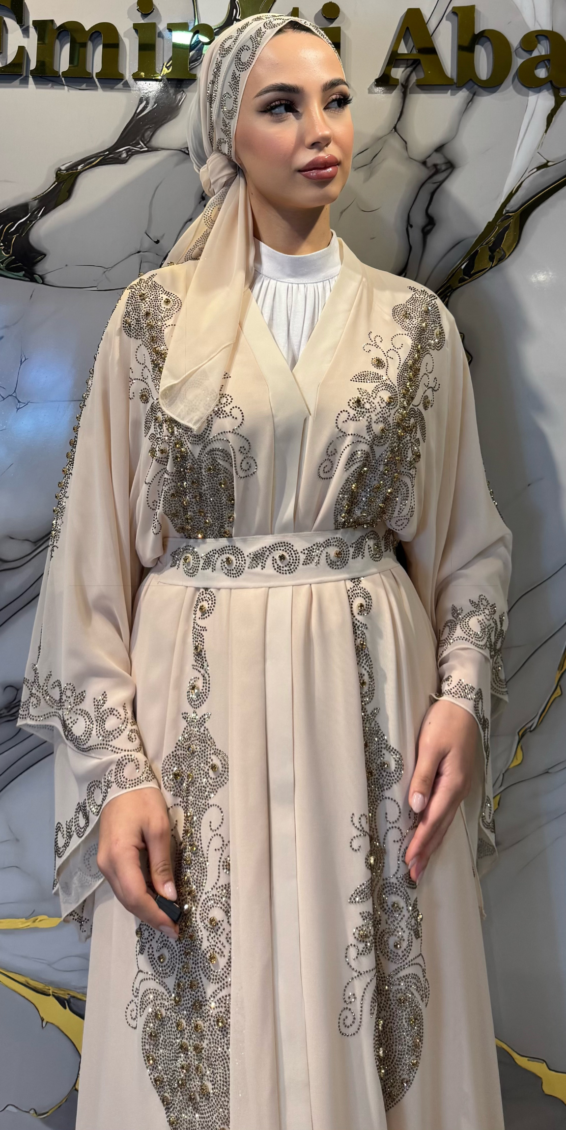Dubai stilinden ilham alınarak tasarlanan bu özel abaya, yüksek kaliteli Kore şifon kumaşı ve altın renk Swarovski taş işlemeleri ile zarif ve lüks bir görünüm sunar. Krem rengin yumuşak ve asil tonu, taşların ışıltısıyla birleşerek sofistike bir şıklık oluşturur.