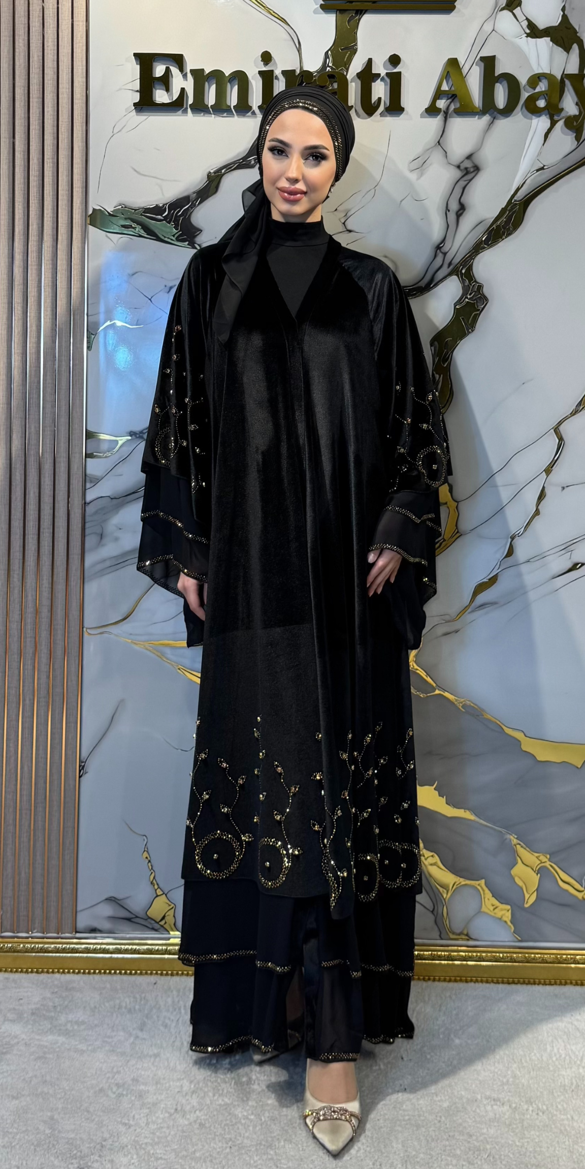 Dubai Tasarım Altın Taşlı Siyah Kadife Abaya
