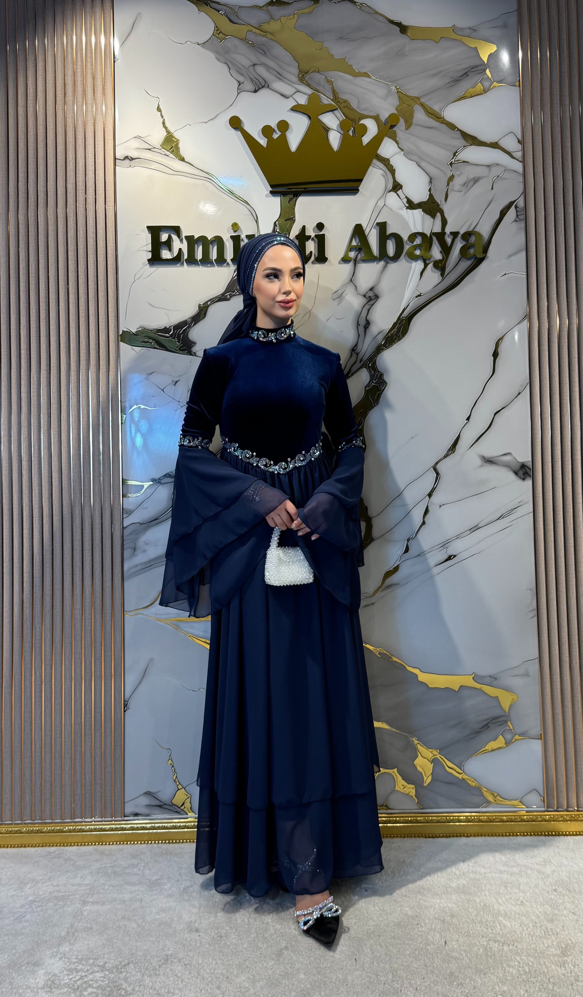Royal Midnight Serenade, asil lacivert tonlarıyla kadife ve şifonun zarafetini bir araya getiriyor. Üst kısmında kullanılan lüks kadife kumaş, etek ve kol detaylarında yerini hafif dökümlü şifona bırakıyor. Yaka, bel ve kol geçişlerinde işlenmiş taşlar abayanın ışıltısını ön plana çıkarıyor. Şalıyla birlikte sunulmaktadır. İçlik ve çanta dahil değildir.