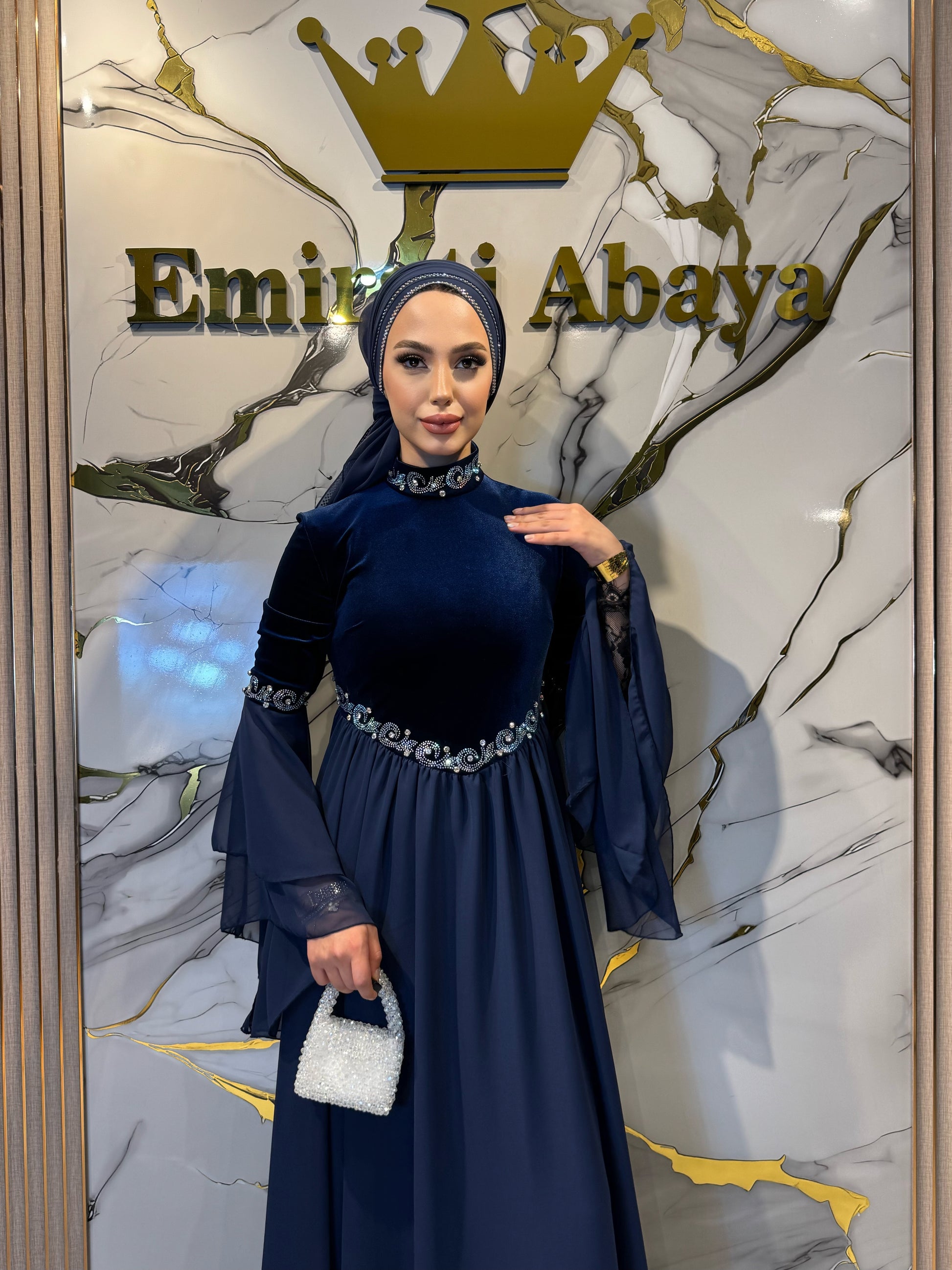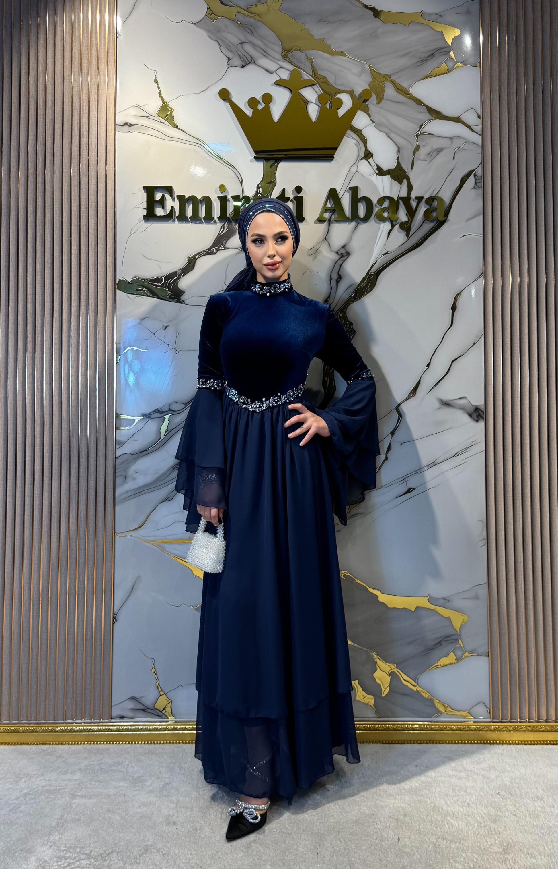 Royal Midnight Serenade Lacivert Kadife Şifon Janjan Taşlı Abiye Elbise