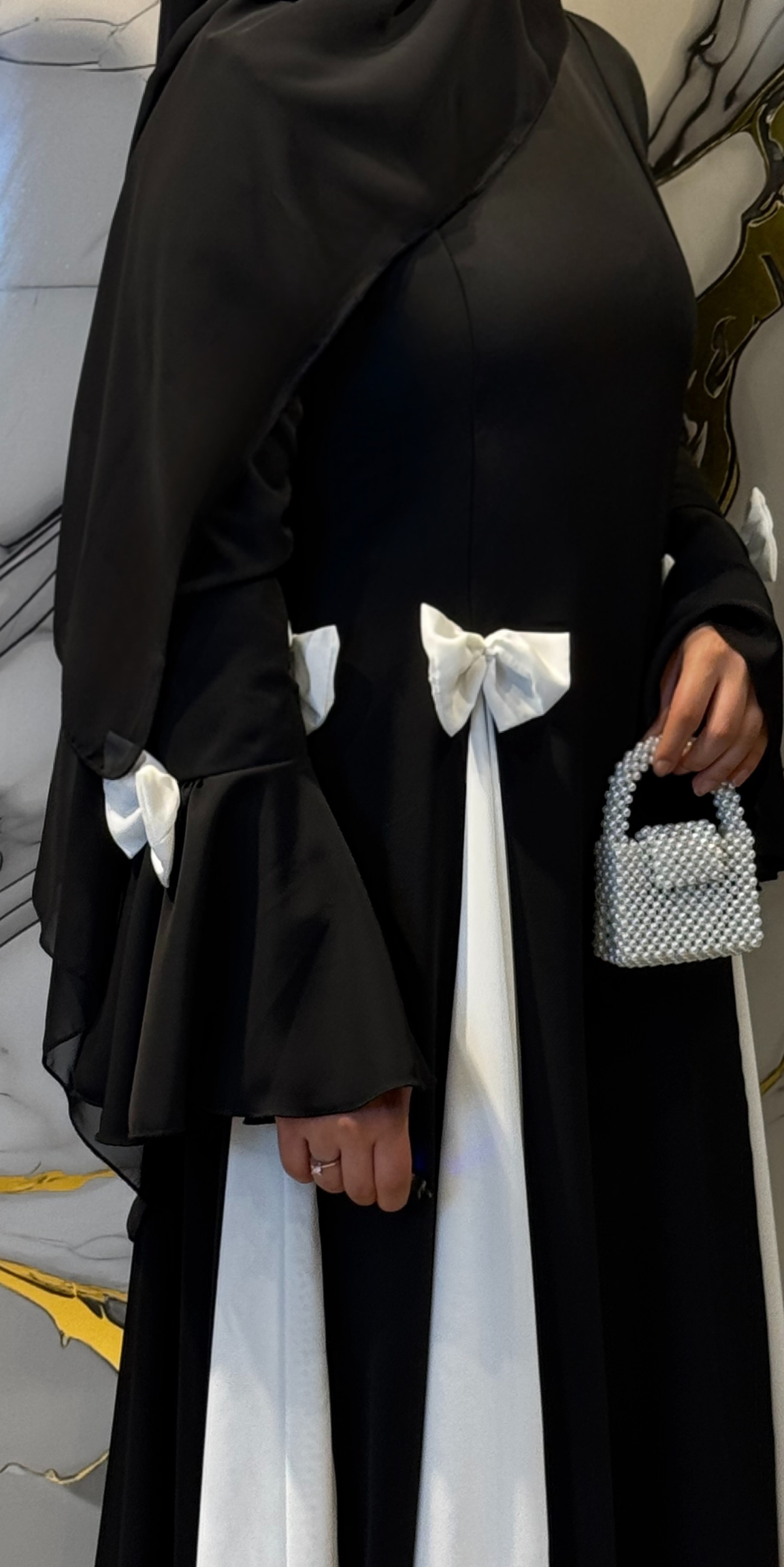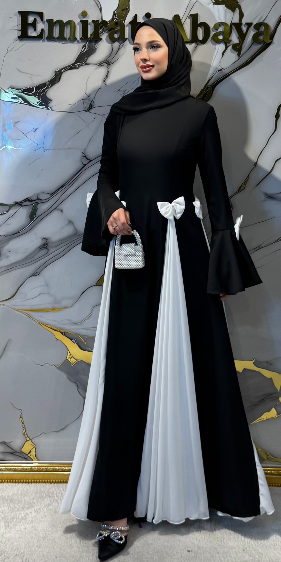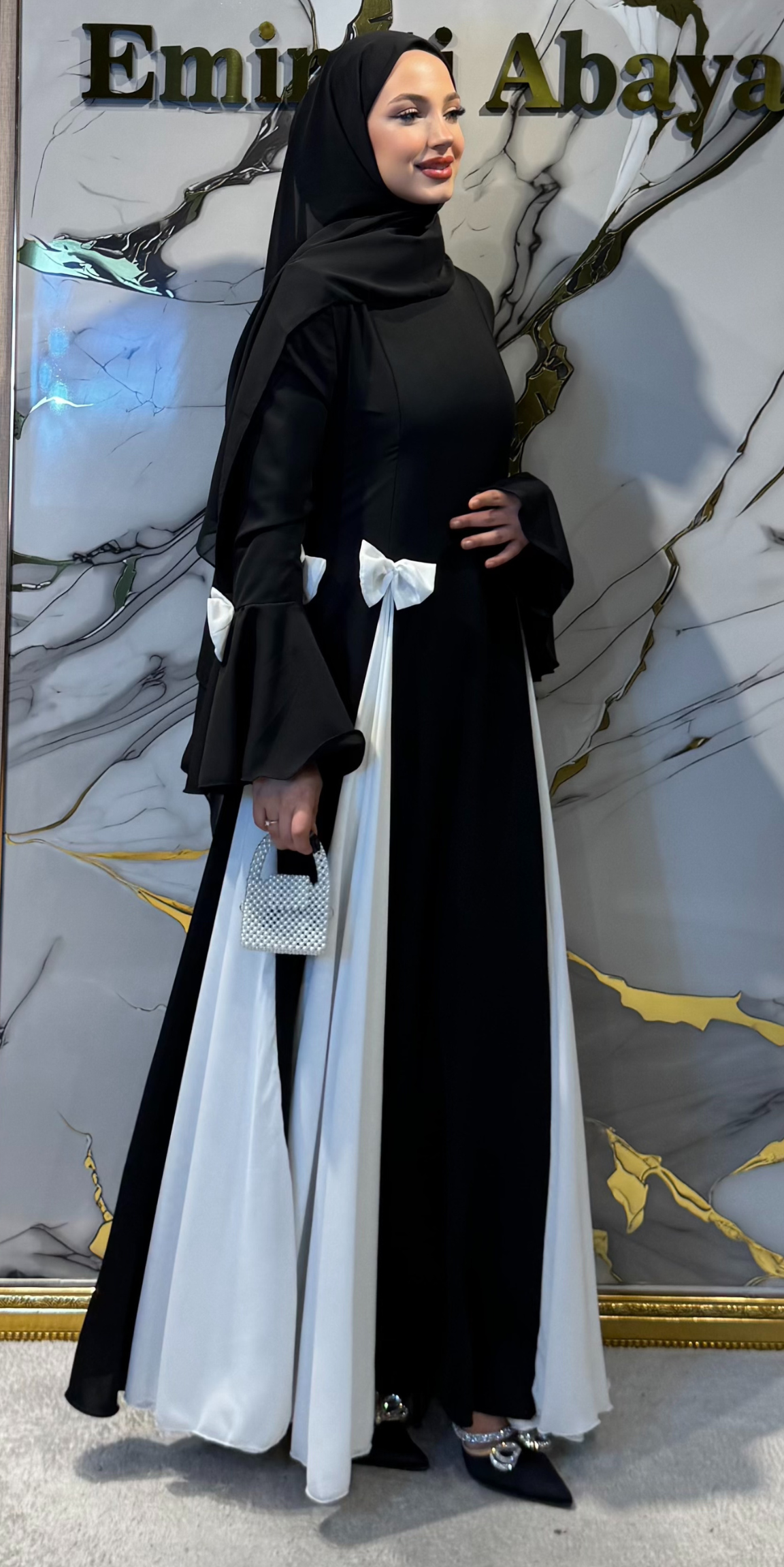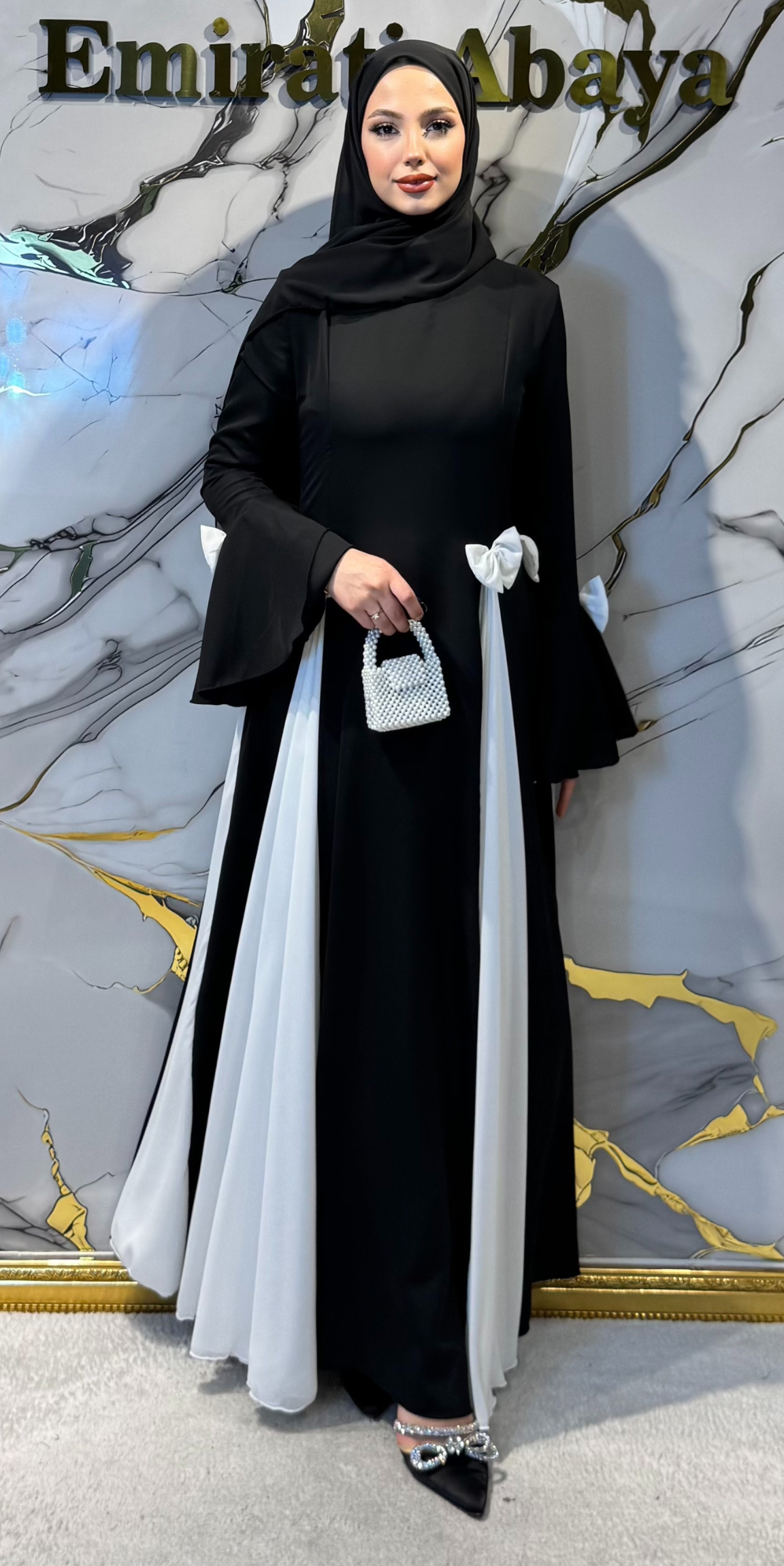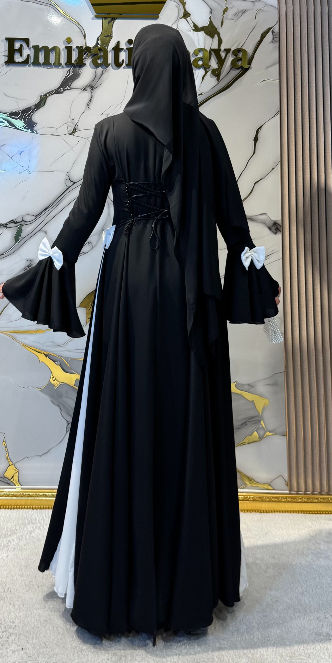 Siyah ve beyaz renk kombinasyonuyla zarif tasarım. Beyaz şifon ve siyah Dubai kumaş karışımı ile hem rahat hem şık kullanım sunar. Kol uçlarında beyaz çiçek detayları ile modern dokunuş. Günlük kullanım için ideal.